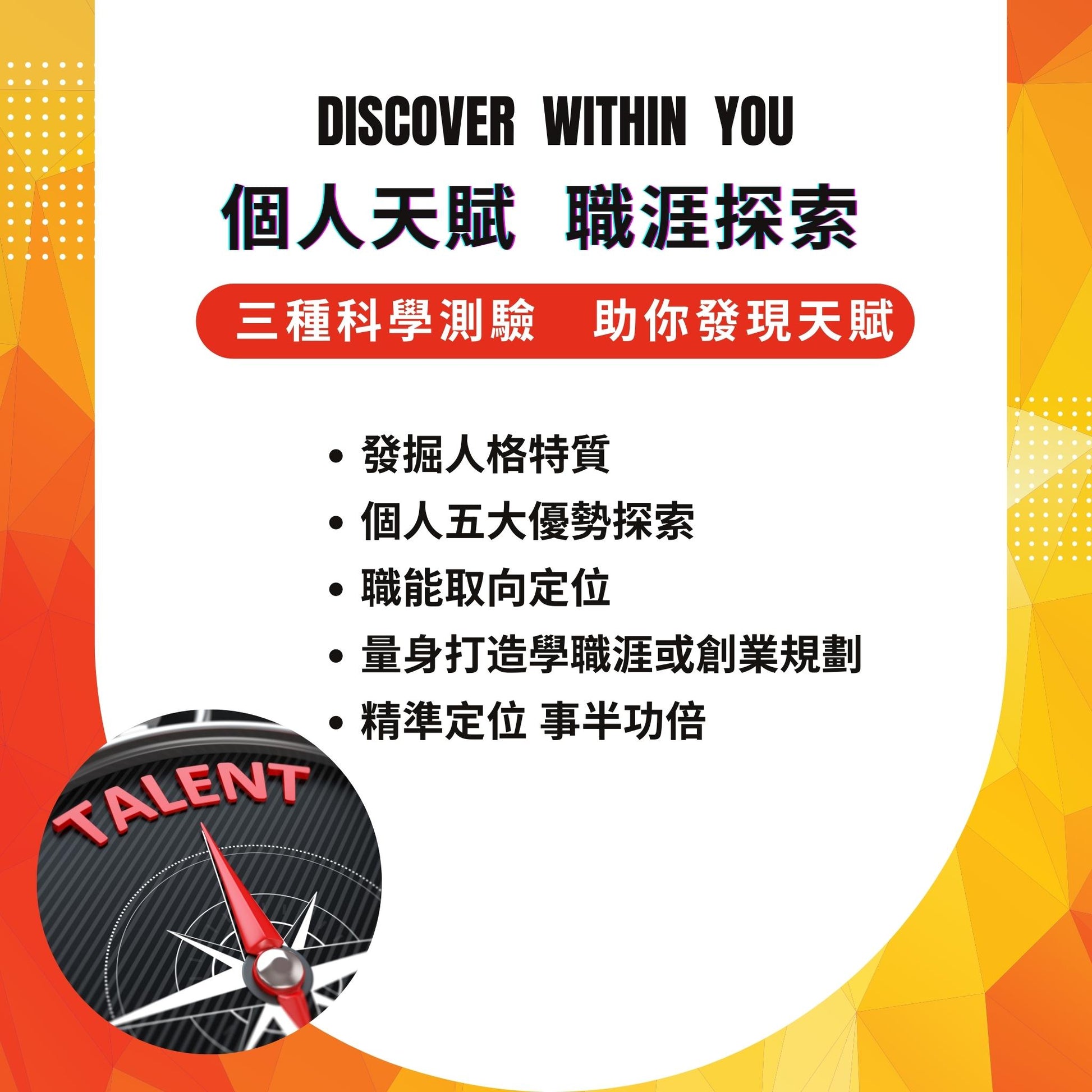 首先謝謝您參加此次測驗,跟著我們一起探索職涯與自我不同的可能性!